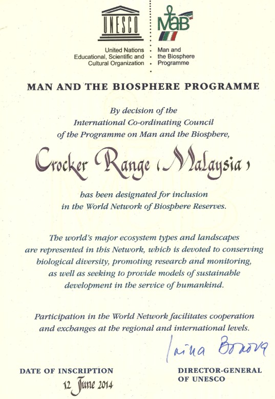 UNESCO has designated Crocker Range Biosphere Reserve (CRBR) in 2014 as a part of World Network of Biosphere Reserve (WNBR) under the Man and Biosphere (MAB) Programme. CRBR located near the south of the World Heritage Site Mount Kinabalu, is the biggest biosphere reserve in Sabah covering about 350,584 hectares of terrestrial ecosystems and natural landscapes. The rocky topography of the Biosphere Reserve constitutes solely of mountains, hills and small basins and small basins dissected by deep river valleys.