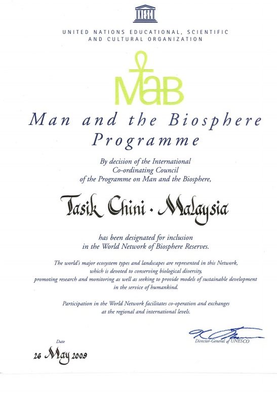 Tasik Chini Biosphere Reserve (TCBR) is the second largest natural freshwater lake in Malaysia and the first in the country to received UNESCO recognition under the UNESCO Man and Biosphere (MAB) Programme in 2009 and therefore listed in the World Network of Biosphere Reserve (WNBR).