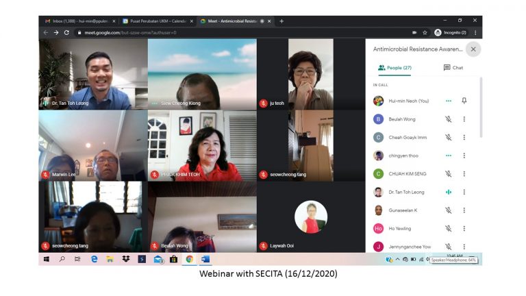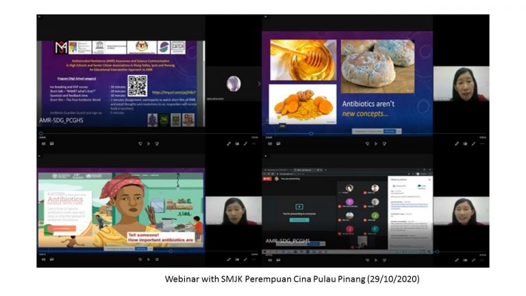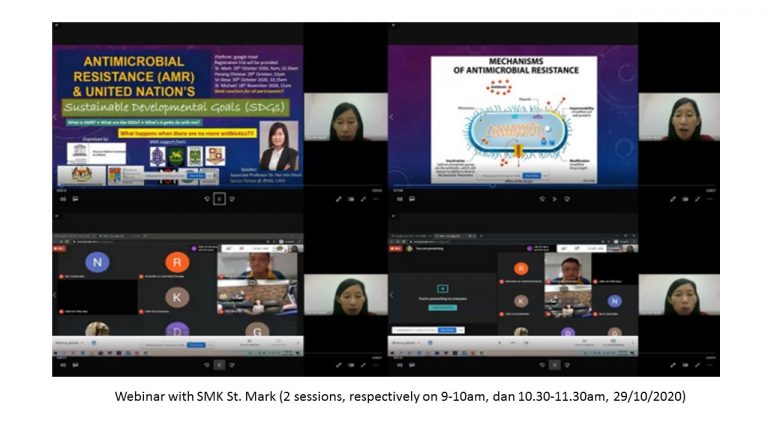 This program was carried out with the objective to communicate and increase awareness among high school students and senior citizens in Penang, lpoh and Klang Valley locations about the importance of antibiotics and the threat of antimicrobial resistance towards the achievement of the United Nations’ (UN) Sustainable Developmental Goals (SDGs).The schools involved in this program are: SMK St. Mark, Penang (2 sessions of webinars), SMJK Perempuan Cina Pulau Pinang, Penang (1 session), SMK St. Michael lpoh (1 session) and Sri Desa lnternational Secondary School, Kuala Lumpur {1 session}. The senior citizen association involved in this program is SECITA (Senior Citizens Association Selangor and FederalTerritory).